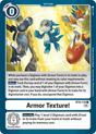 While you have a Digimon with [Armor Form] in its traits in play, you may use this card without meeting its color requirements.[Main] Trash the top card of 1 of your Digimon with [Armor Form] in its traits. Then, you may digivolve 1 of your Digimon into a Digimon card in your hand with [Armor Form] in its traits for its digivolution cost. If you do, unsuspend that Digimon.
