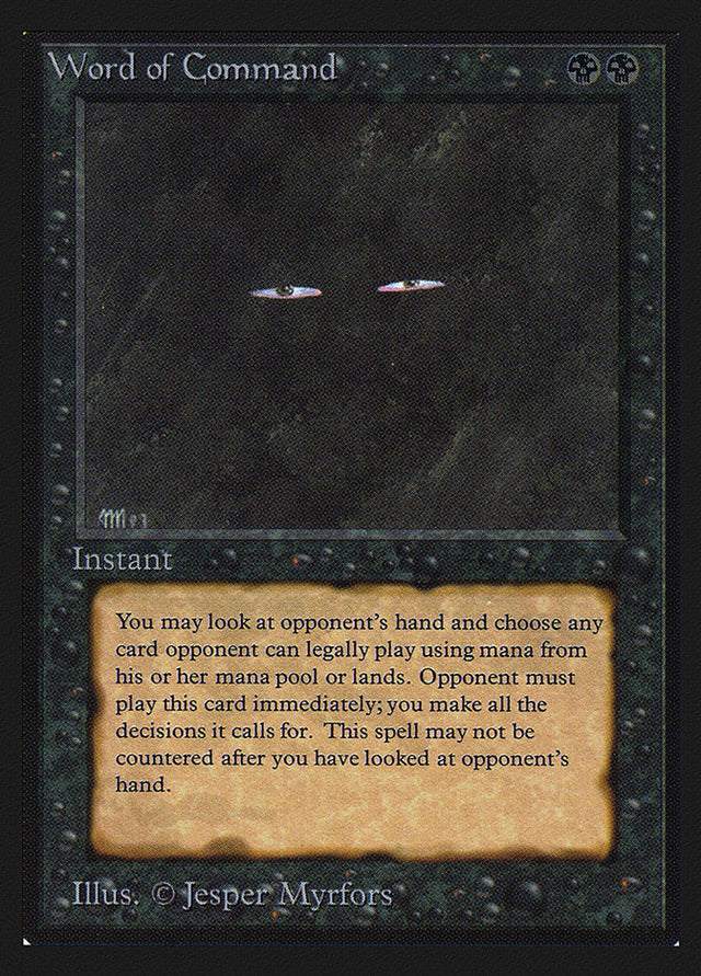 Look at target opponent's hand and choose a card from it. You control that player until Word of Command finishes resolving. The player plays that card if able. While doing so, the player can activate mana abilities only if they're from lands that player controls and only if mana they produce is spent to activate other mana abilities of lands the player controls and/or to play that card. If the chosen card is cast as a spell, you control the player while that spell is resolving.