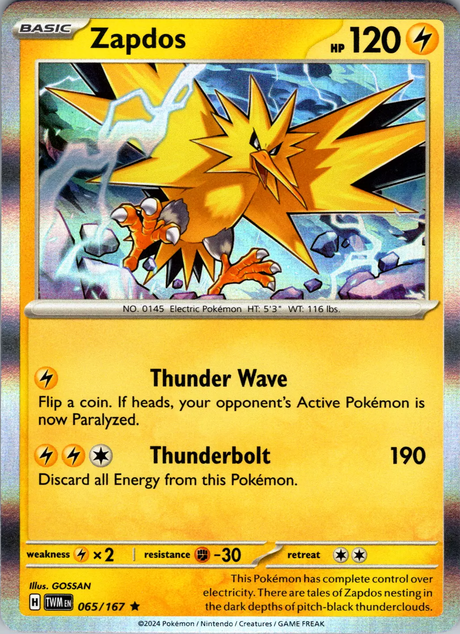 In stock (9 units)$0.15Unit price /UnavailableZapdos (065/167) [Scarlet & Violet: Twilight Masquerade]